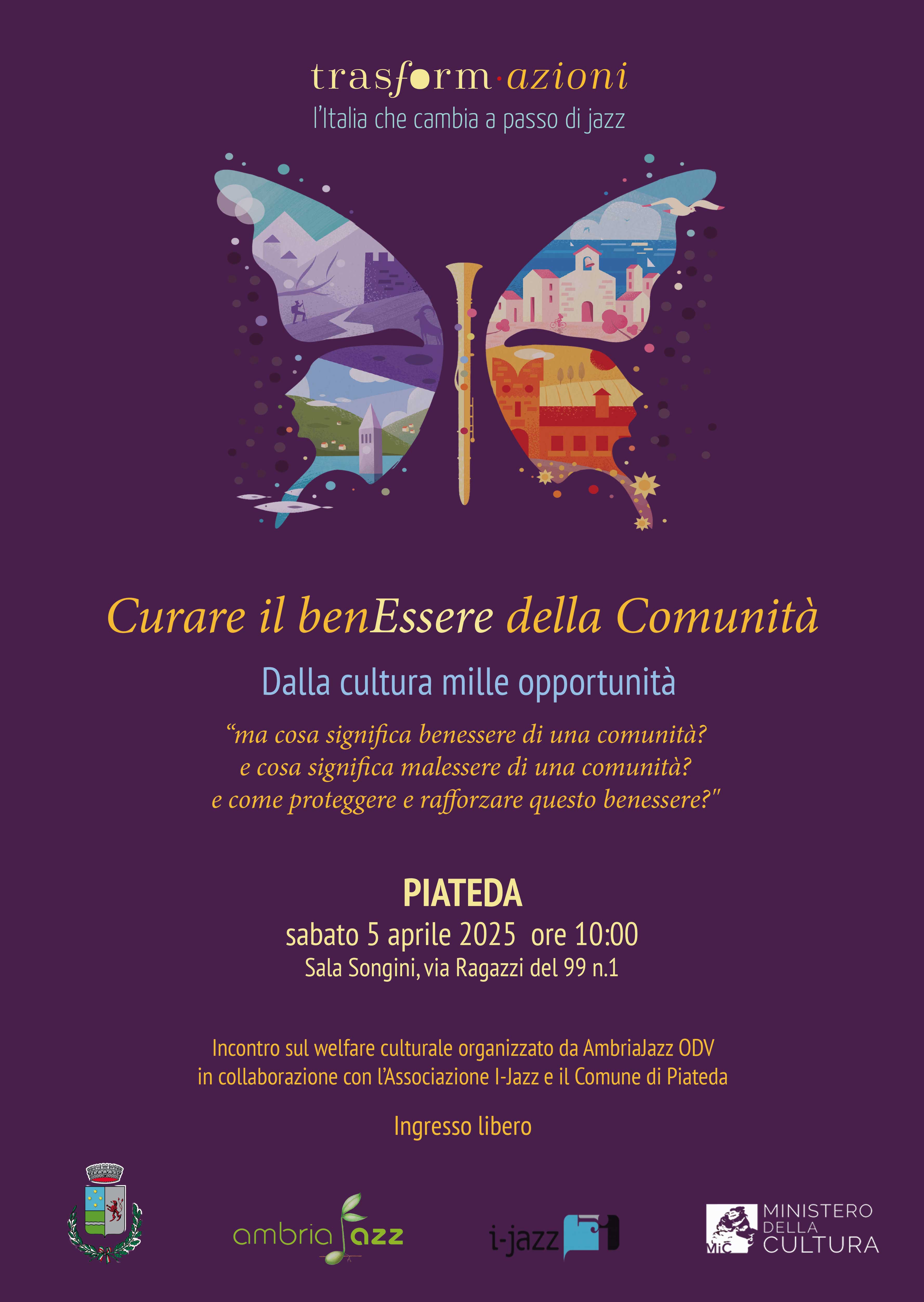 Il Comune di Piateda e AmbriaJazz ODV ha organizzato la conferenza "Curare il BenEsser della comunità" che si terrà a Piateda il prossimo 05 aprile alle ore 10 presso la Sala Songini (Via Ragazzi del '99 n. 1 - Piateda).